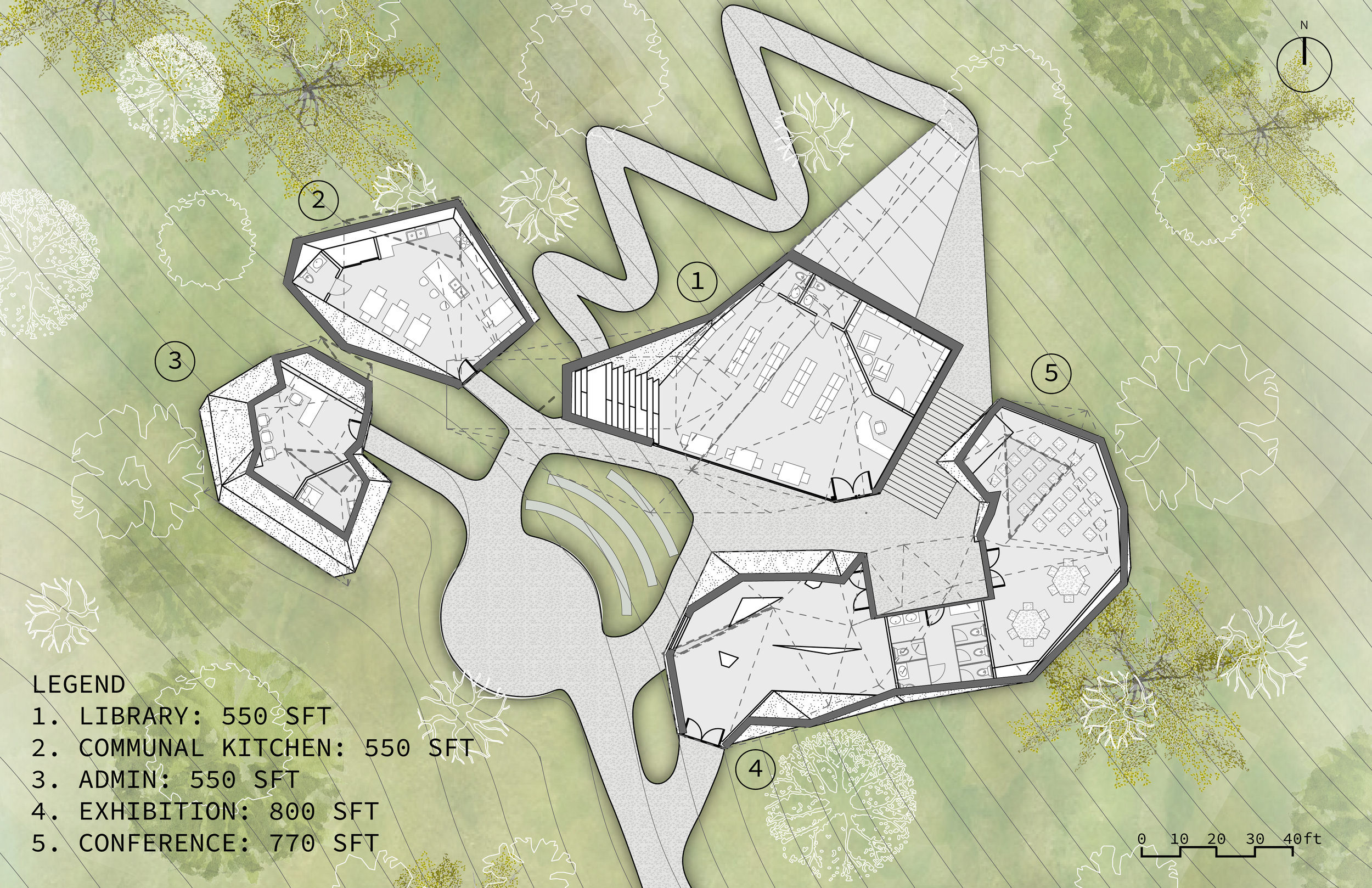 The Main House is the hub of the site for public programming including a gallery, library, and conference spaces and programming including a communal cooking and dining space and research center. Our roof plan presents an ADA accessible ramp that leads to an overlook point above the library.